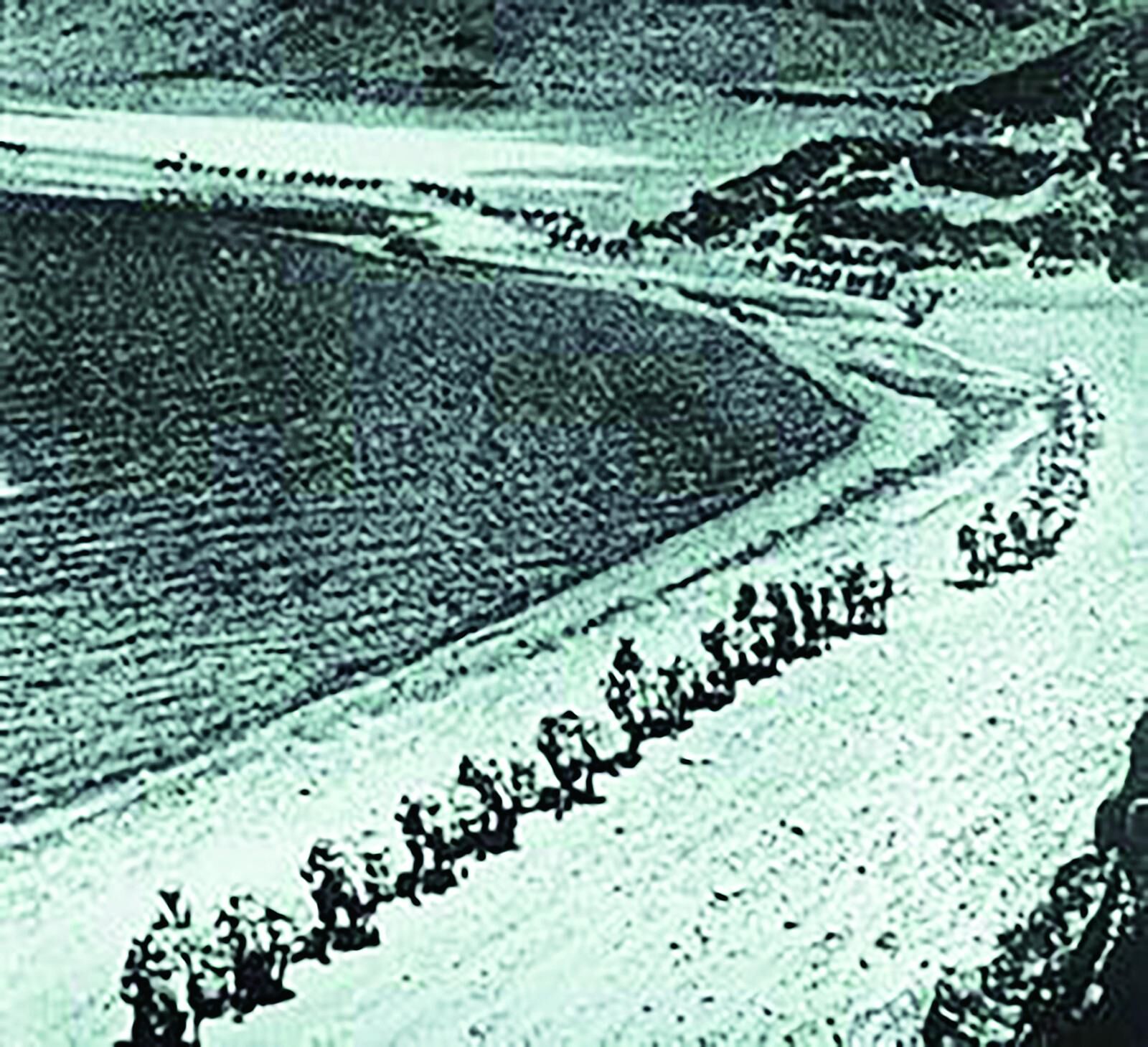 1954年4月,慕生忠宣布,筑路工程队正式成立。工程队下设2个测量队、6个施工队和1个后勤保障单位。随后,筑路大军带着帐篷,牵着骆驼,用大锤铁锹叩响了天路之门。