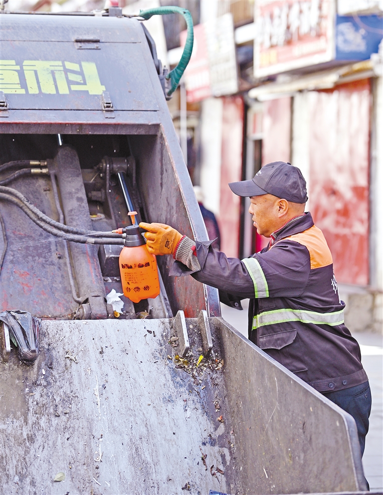 图为环卫工人在拉萨市城关区吉崩岗街道策门林社区小巷清洁垃圾车。记者 唐斌 摄