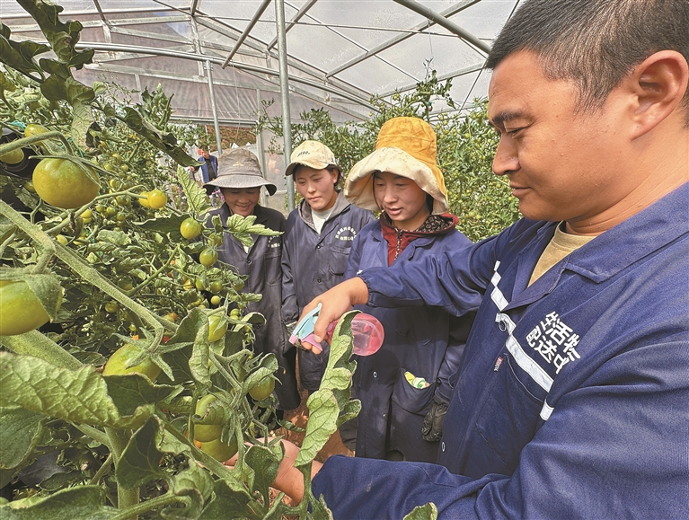 图为贡觉县现代农业产业园的技术员向当地就业青年教授小番茄种植技术。记者 白玛泽旺 次仁平措 摄