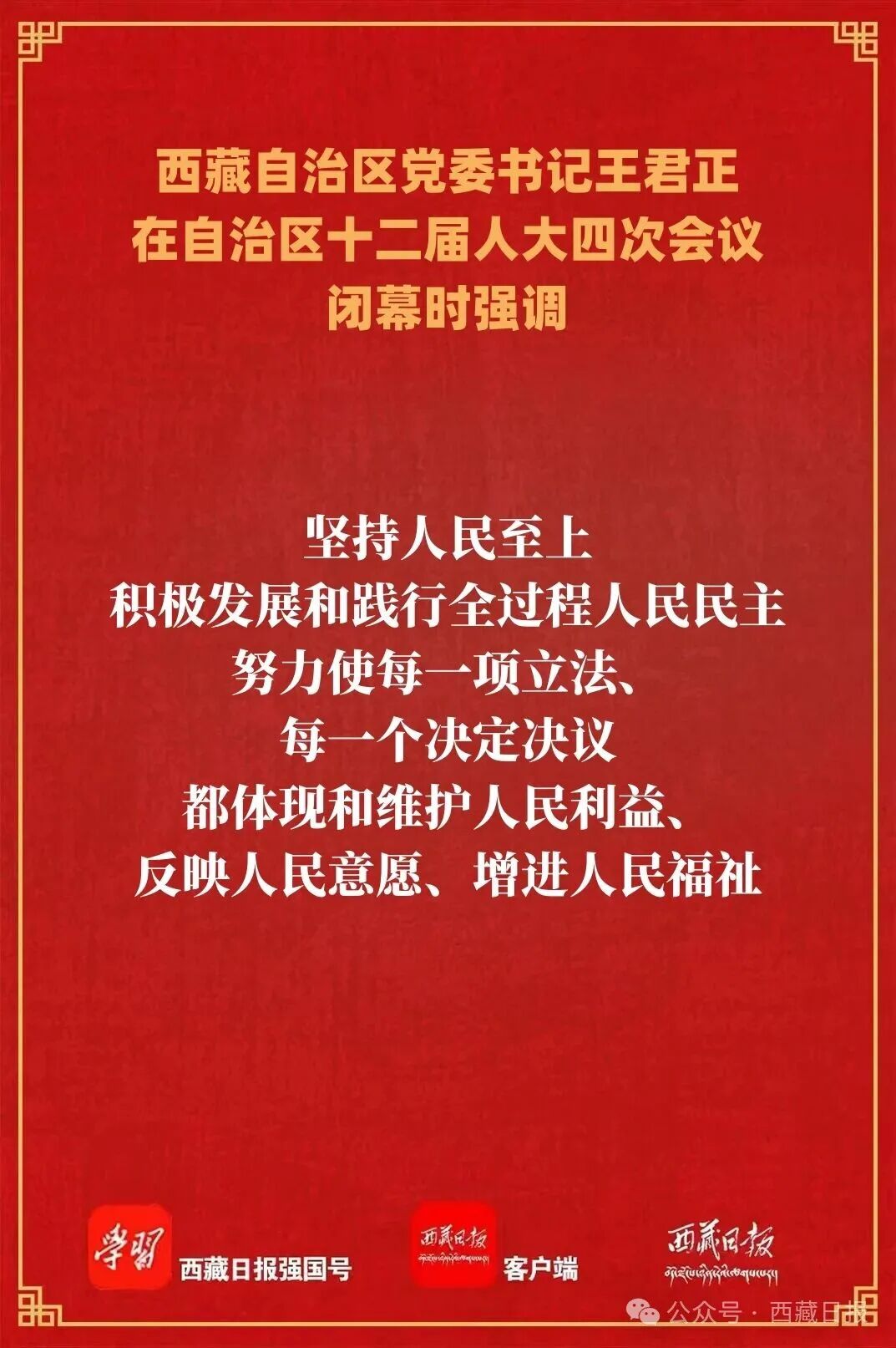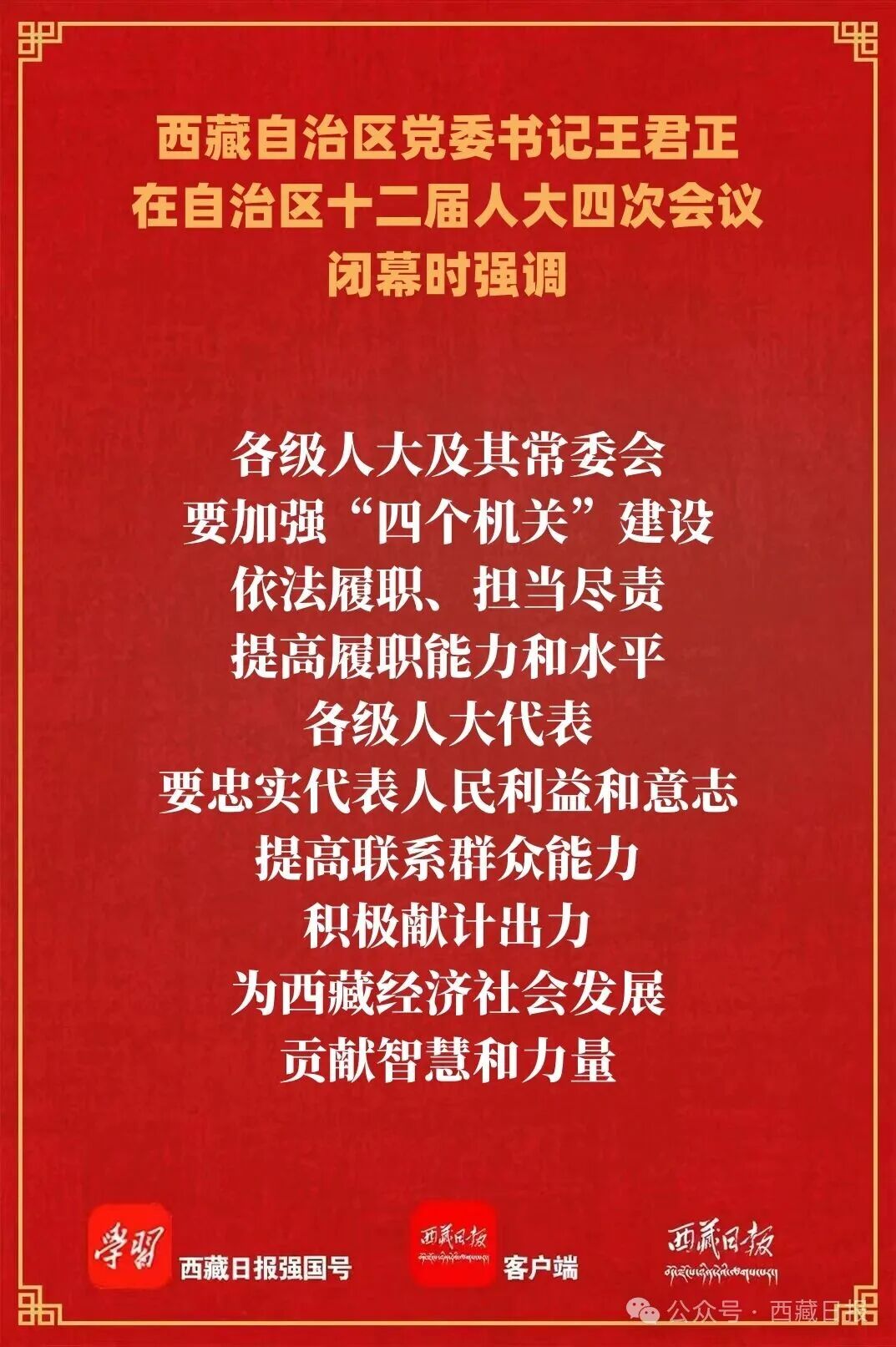 王君正强调,开局关乎全局,起步决定后势。全区各级人大和人大代表要坚持以习近平新时代中国特色社会主义思想为指导,坚决贯彻落实习近平总书记关于坚持和完善人民代表大会制度的重要思想,坚持党的领导、人民当家作主、依法治国有机统一,认真履行宪法法律赋予的各项职责,推动新时代人大工作高质量发展,努力为全区工作大局贡献更大力量。提高政治站位,坚持把党的领导贯穿人大工作全过程、各方面,保证党的路线方针政策和决策部署得到全面贯彻和有效执行。坚持人民至上,积极发展和践行全过程人民民主,努力使每一项立法、每一个决定决议都体现和维护人民利益、反映人民意愿、增进人民福祉。推进高质量立法,紧紧围绕“四件大事”落实,从“小切口”入手加强立法,科学立法、民主立法、依法立法,深入实施法治宣传教育,为全面依法治藏提供更加完善的法治保障。增强人大监督质效,围绕“十五五”规划实施,增强监督针对性、实效性、科学性,深化人大监督成果运用,切实解决改革发展、社会民生等领域突出问题,积极促进西藏经济社会高质量发展。发挥带头作用,多做宣讲政策、协调关系、增进团结的工作,密切同人民群众的联系,当好党和政府联系人民群众的桥梁,切实把社会各方面的思想和行动统一到党中央关于西藏工作的决策部署上来,统一到自治区党委工作安排和要求上来,广泛凝聚磅礴力量,为建设团结富裕文明和谐美丽的社会主义现代化新西藏而努力奋斗。