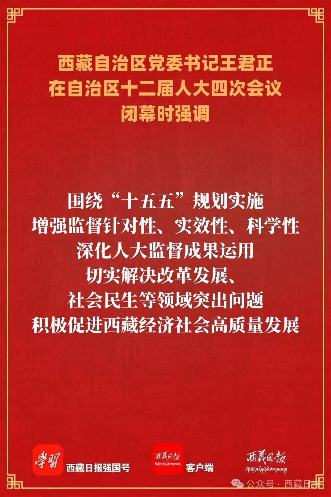 王君正指出,自治区十二届人大四次会议是一次高举旗帜、凝心聚力、团结奋进的大会。会议期间,与会代表以饱满的政治热情,聚焦党中央决策部署和自治区党委工作安排,聚焦未来五年西藏经济社会发展,聚焦人民群众所思所盼所想,依法履职尽责,积极建言献策,展现了新时代西藏人大代表的良好精神风貌和使命担当。与会代表高度评价了“十四五”时期西藏经济社会发展取得的重大成就,一致认为,在以习近平同志为核心的党中央坚强领导、关心重视下,自治区党委团结带领全区各族干部群众,经过五年不懈努力,推动西藏经济社会持续快速发展,社会主义现代化新西藏建设迈出了坚实步伐、站在了新的历史起点上。与会代表充分肯定了2025年全区经济社会发展取得的成绩,一致认为,2025年是西藏发展历程中极不平凡的一年,习近平总书记率中央代表团出席自治区成立60周年庆祝活动,听取自治区党委和政府工作汇报并发表重要讲话,这在党和国家历史上是第一次,极大鼓舞了全区各族人民共建中华民族共同体、书写美丽西藏新篇章的信心决心;全区各级党委、政府坚持以习近平总书记视察西藏时的重要讲话精神统一全区广大干部群众思想,坚持稳中求进工作总基调,统筹兼顾,持之以恒推动稳定、发展、生态、强边四件大事落实,着力保稳定、抓经济、促发展,各项事业不断取得新进步。与会代表深刻认识到,习近平总书记关于西藏工作的重要指示英明正确,新时代党的治藏方略完全符合西藏实际,只要我们坚定不移沿着习近平总书记指引的方向奋勇前进,只要我们不折不扣把党中央各项决策部署贯彻好落实好,西藏经济社会发展就会不断从胜利走向新的胜利。