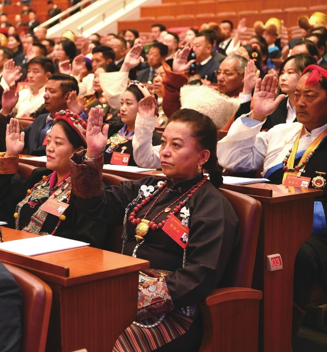 人大代表们举手表决各种决议草案。西藏日报记者 洛桑 摄
