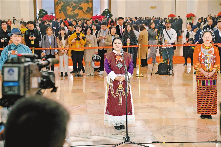 图为住藏全国政协委员白玛玉珍(中)在“委员通道”上介绍墨脱的发展变化。 记者 旦增平措 次旦央吉 摄