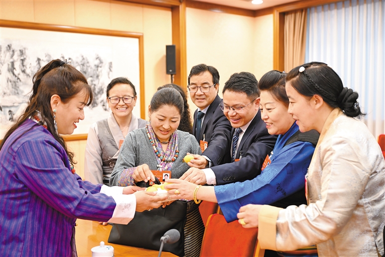 3月8日,西藏代表团举行全体会议,审议全国人大常委会工作报告。图为会议结束后,全国人大代表罗布央宗把从家乡墨脱带来的特产分享给与会代表们品尝。记者 旦增西旦 摄