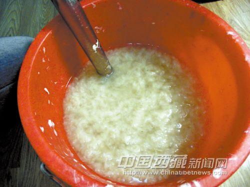 次仁多吉老人正将原浆铺放平展的木边纱框端出水池,晾干后即可起纸。
