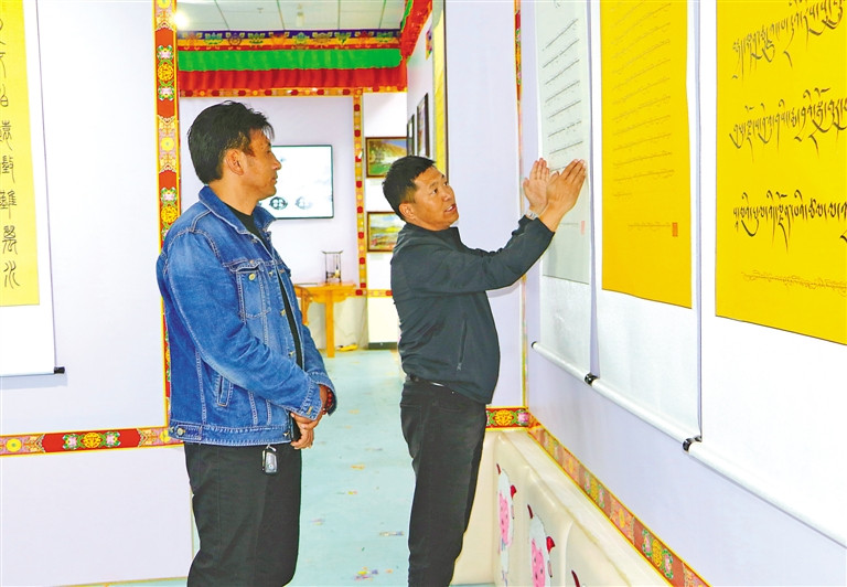 山南市优秀书法摄影展工作人员正在向参观者讲解藏文书法艺术。