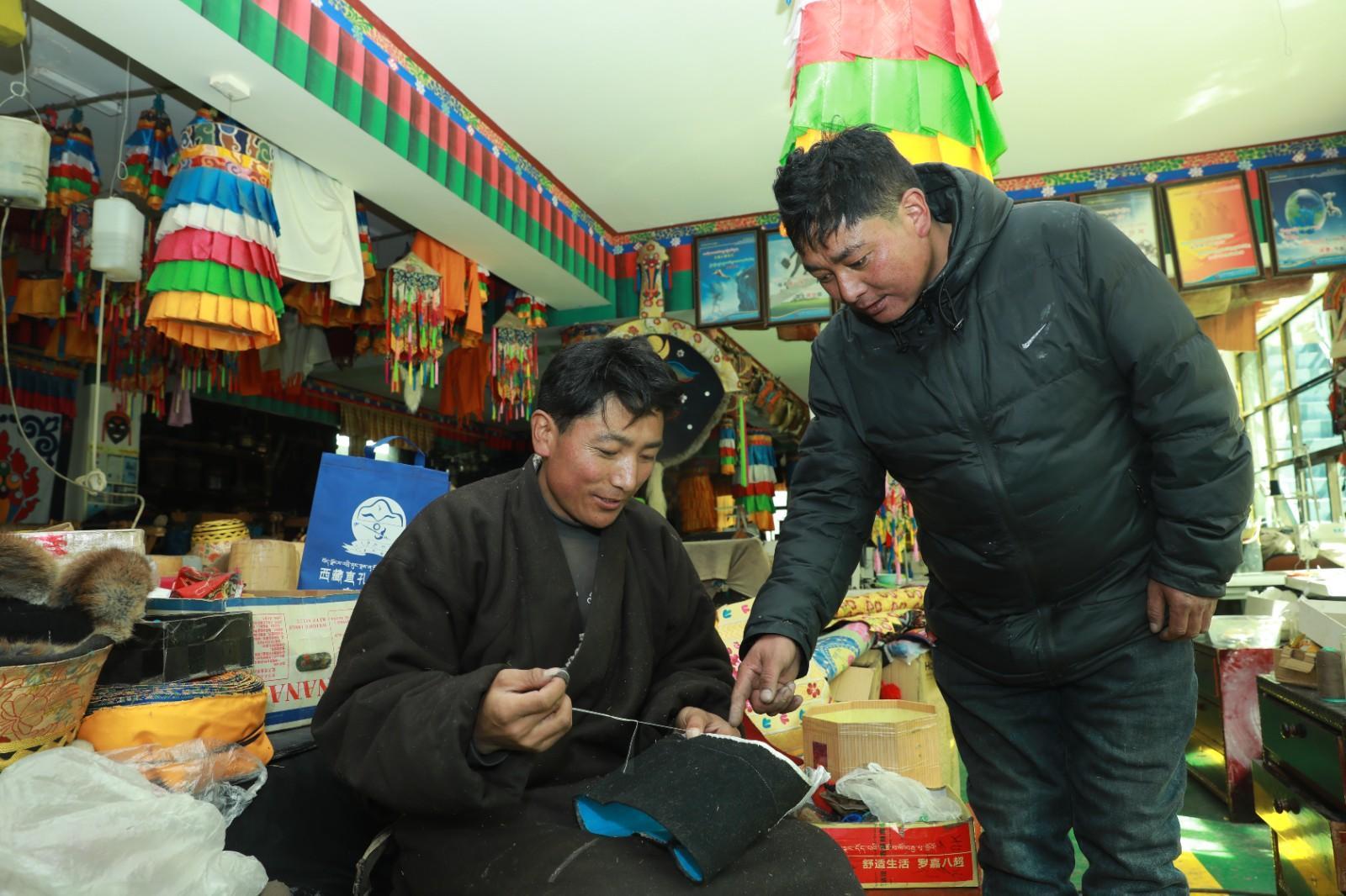 而在以前,这门祖传的技艺并没有为贡觉群培一家带来多少收入。如果附近的村民有制作衣服、帽子或者靴子的需要,就会备好原料,请手工艺人上门制作时管吃管喝,或者是在手工艺人家修建房屋时免费帮忙,算是一种传统方式的等价交换。近年来,在墨竹工卡县委、县政府以及各级妇联的大力支持和帮助下,索朗顿珠一家人瞅准了商机,创办了墨竹工卡县朗瑕传统针织加工专业合作社并正式注册。合作社创办之初,一家人历经了诸多困难和挑战。没资金,就一趟趟往县里跑;没员工,就一遍遍去贫困户家里给他们做思想工作,让他们来有偿工作。通过不懈努力,他们最终获得国家扶持资金100万元,加上合作社自筹资金70万元,改扩建了500平方米的厂房。改建后的厂房既能加工、生产、销售,还能组织技能培训,经营的产品包括藏装、氆氇、藏包、藏帽、藏皮靴等工艺品和旅游产品,产品远销区内外。