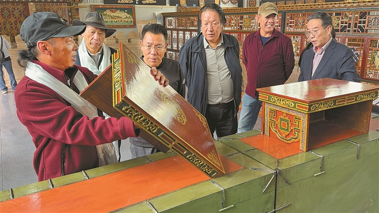 加措(左一)为业内专家学者介绍创新折叠式藏式家具。