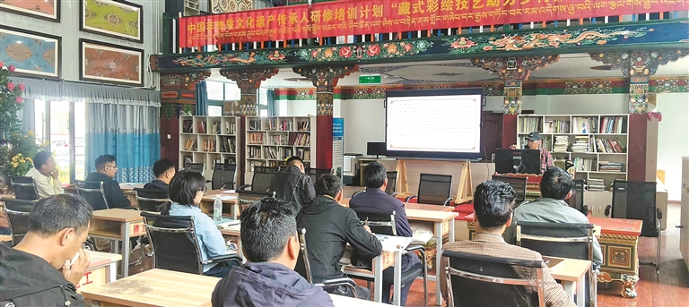 加措在“藏式彩绘技艺助力乡村振兴技能研修班”中为学员讲解传统藏式木雕和彩绘技艺。记者 格桑伦珠 摄