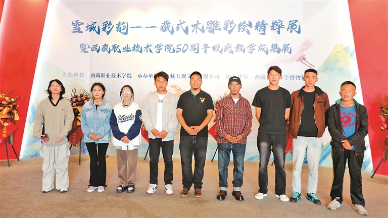 加措和学生在“雪域彩韵——藏式木雕彩绘精粹展”上合影留念。
