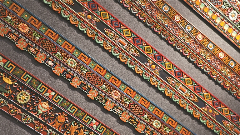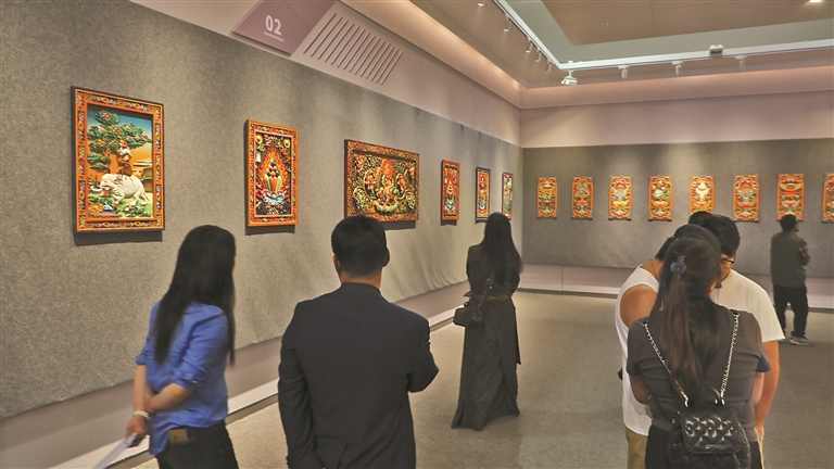 2024年,市民参观“雪域彩韵——藏式木雕彩绘精粹展”暨西藏职业技术学院50周年校庆教学成果展。
