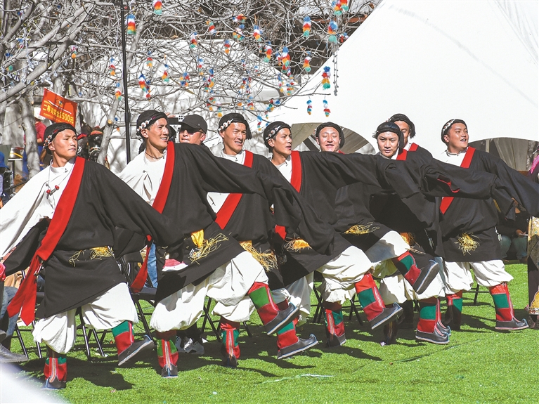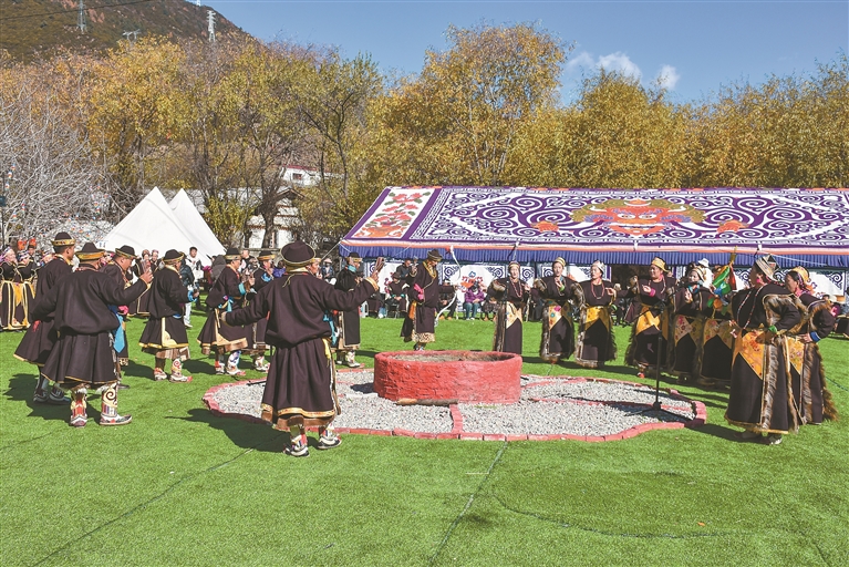 图为林芝市布久乡麦巴村群众带来的非遗舞蹈《工布切巴博》。