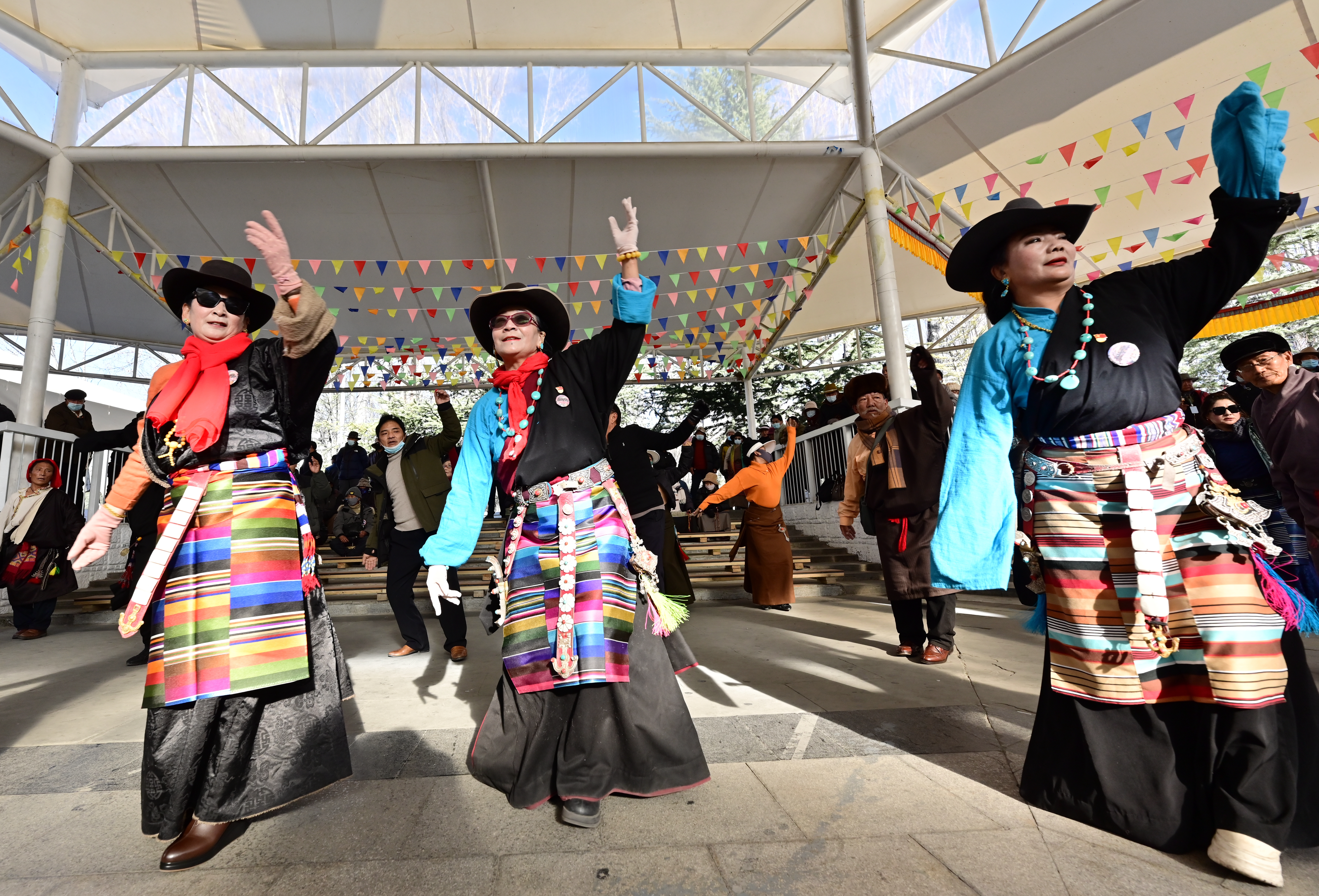 锅庄舞不局限于舞台表演的形式,而是一种群众性、生活化的娱乐活动。无论公园、广场,还是街边的空地,处处都能成为锅庄的舞台,能洋溢出浓郁的生活气息和轻松欢快的氛围。