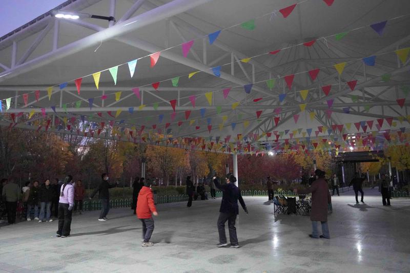 傍晚的林琼公园内正在跳锅庄舞的人们。记者 明吉 摄