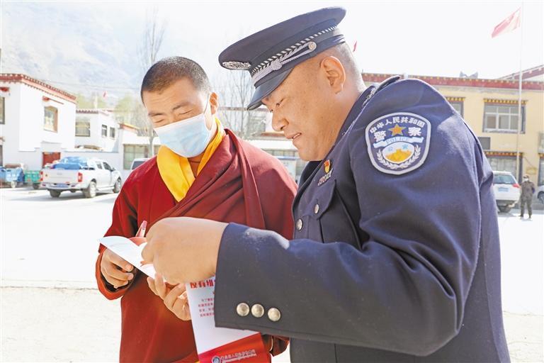 图为普兰出入境边防检查站民警在科迦寺开展普法宣讲。 记者 王香香 摄