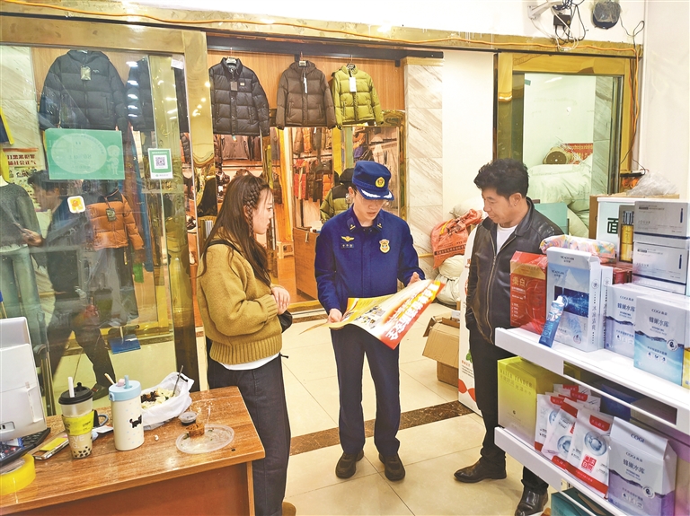 拉萨市消防救援支队宣传员为商贸市场商铺店主强调消防安全。