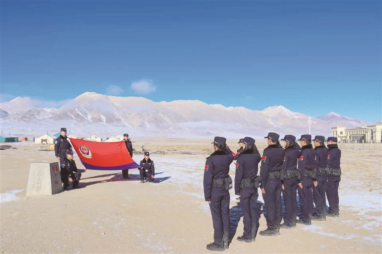 同一时间,里孜出入境边防检查站内,警旗冉冉升起。为庆祝第六个中国人民警察节,民警们先赴仲巴县爱国主义教育基地——扎东特委旧址回溯革命历史,再到烈士陵园缅怀先烈。为提升新入职民警业务能力,老民警还带领他们踏雪巡边,结合实际工作讲解巡边流程、管控规范与突发情况处置技巧,并在界桩与警旗前重温入警誓词。这场“红色铸魂+实战练兵”的庆祝活动,让忠诚底色在边关愈发鲜明。