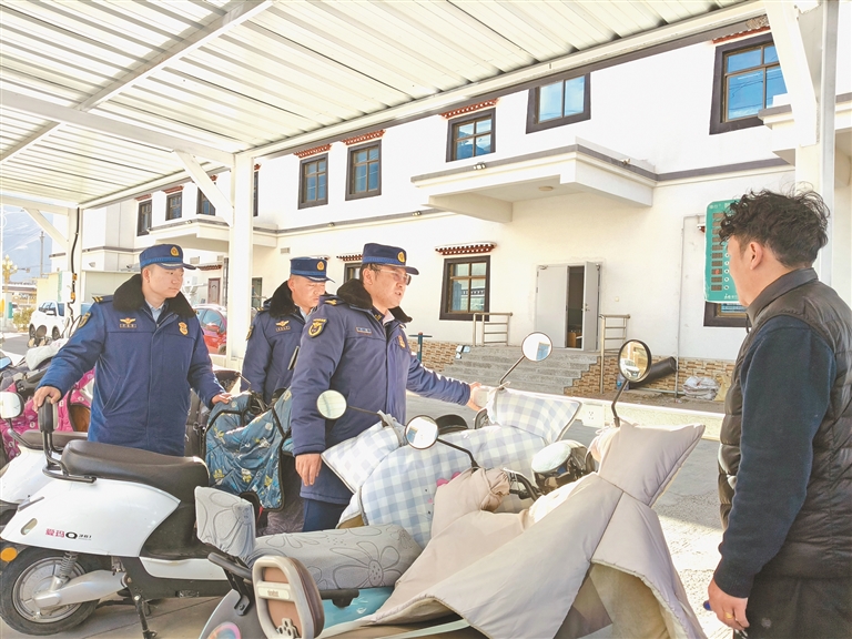检查与宣传活动同步推进。宣传骨干采取“集中宣讲+入户答疑”相结合的方式,在停放场所设置宣传点位,粘贴宣传海报,摆放火灾案例展板,向过往群众发放藏汉双语《电动自行车消防安全手册》《家庭防火指南》等宣传资料。