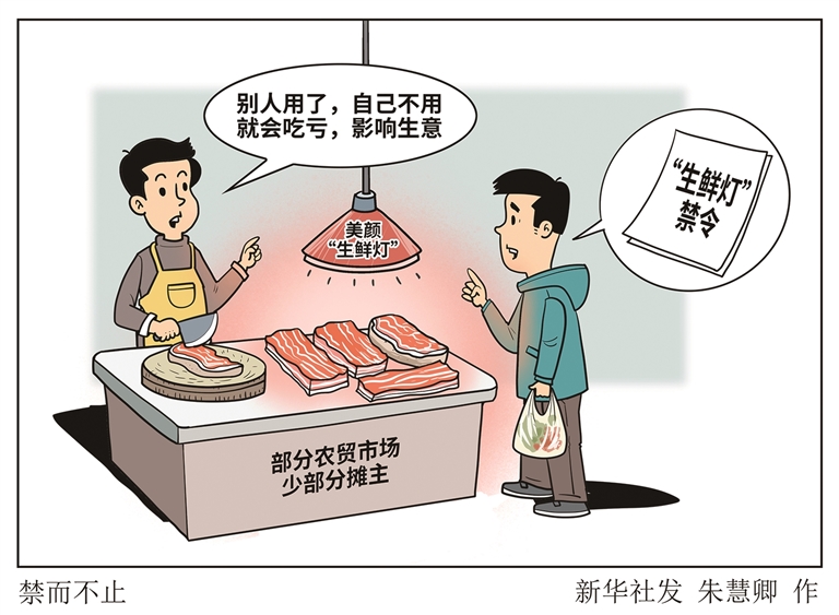 如今,新规施行逾两年,“新华视点”记者走访调查发现,在一些地方部分农贸市场和非固定摊位,“生鲜灯”仍有使用。