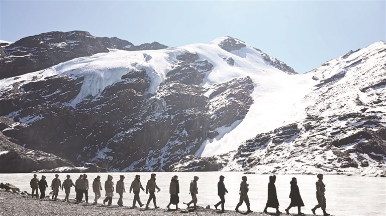 “这里的山看着壮丽,却是‘生命禁区’。冬天巡逻时,面罩上都会结一层薄冰。”戍边战士搀扶着清华学子说道。清华学子与戍边官兵一同走在这条海拔4000多米、含氧量只有海平面的50%—60%、海拔落差近1000米的巡逻路上,顶着寒风、踏着大雪一步一步地亲身感受着戍边官兵的坚守与奉献。