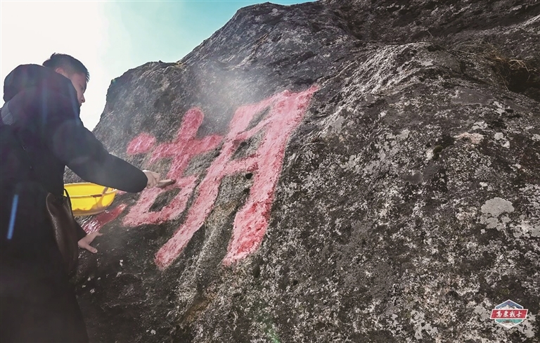 清华大学师生与官兵一同为哨所最高点的“无名湖”石碑描红。通讯员 张劲 摄