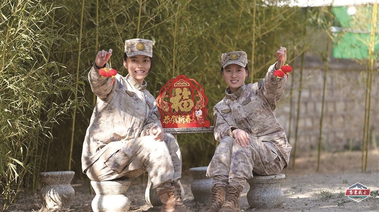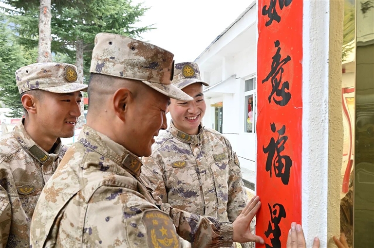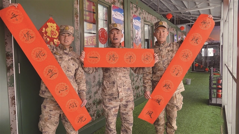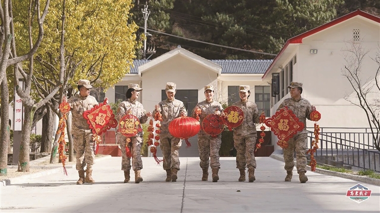 挂灯笼、贴春联、布展板、扮营院……官兵齐动手、分工协作,主干道两侧红灯笼高高悬挂,宿舍门前春联福字相映生辉,文化长廊、执勤哨位处处点缀新春元素,中国红与迷彩绿交相辉映,既有传统佳节的祥和喜庆,更透着军人本色的庄严厚重。