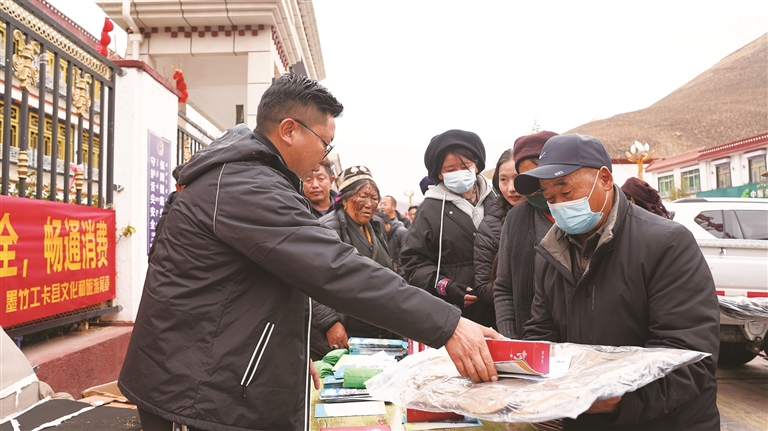 图为墨竹工卡县市场监督管理部门工作人员为市民发放宣传资料。