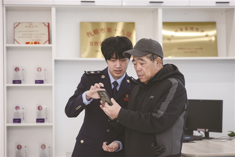 国家税务总局抚顺市望花区税务局雷锋税务分局代办员王英博(左)帮助灵活就业人员办理医保相关业务。 新华社记者 潘昱龙 摄