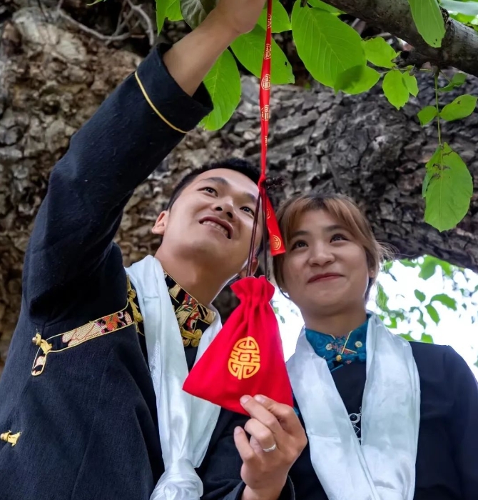 在加查县拉岗村,有一大片美丽的千年核桃林景区。其中最长寿泉大最老的核桃树已经1500 岁,被当地群众尊为 “神树”,具有吉祥安康的寓意。9月23日,新人队伍来到千年核桃林景区。当地藏民们身着民族服饰,为他们献上了美丽的哈达和特色美食,用欢快的歌唱表达了美好真挚的祝愿。在千年核桃园区内,新人们取下寓意幸福美满的锦囊,并在树下拍照、祈福。