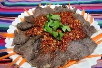 1.凉拌牦牛肚:做法很简单:将牛肚煮熟,加上喱哩粉、茴香和辣椒粉,以及辣椒,葱段。 注意的是牛肚必须煮透。