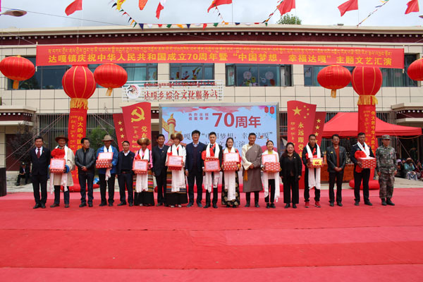 再次,由达嘎镇党委副书记、镇长毛鑫同志宣读了达嘎镇庆祝新中国成立70周年先进集体、典型人物表彰决定,现场邀请参会领导为色甫村村委会等9个先进集体,扎西罗布等9名各行业优秀工作者和米玛顿珠等18名优秀学生进行表彰。由各村、学校、党政机关以歌舞、大合唱、小品独唱等喜闻乐见的方式,讴歌党、讴歌祖国,展现中华人民共和国70年来取得的辉煌成就,展示改革开放后的乡村新面貌。