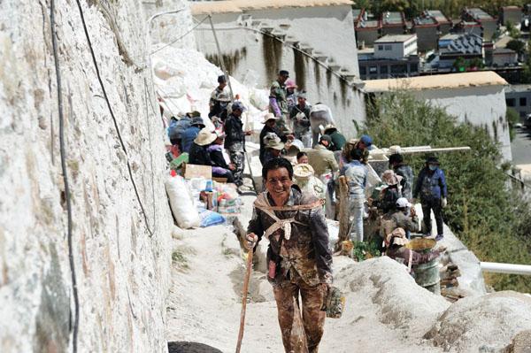 每年的雨季过后,就到了布达拉宫粉刷的时节。
