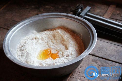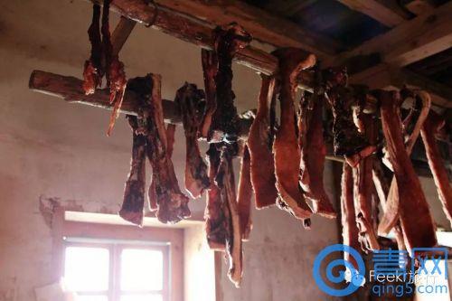 母亲和卓玛的哥哥在厨房忙活起来,小麦现磨成粉,和好面,再用压面机压出面条。房梁上悬挂的咸肉拿来做臊子,还切了嫩姜做小菜。