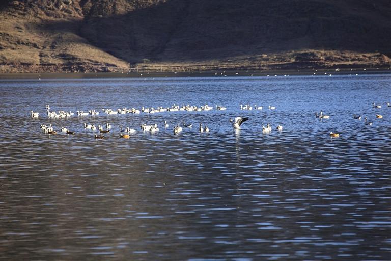 享受了片刻的农家乐,换个视角,不远处就是卡孜水库,水面上是成群的赤麻鸭、班头雁,它们时而斗弄翅膀、时而发出鸣叫,好一幅怡然自得的景象。