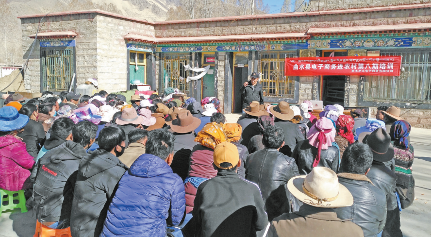 2018年拉萨市曲水县举办的电子商务进农村培训上,贡布多杰为当地农牧民群众授课。