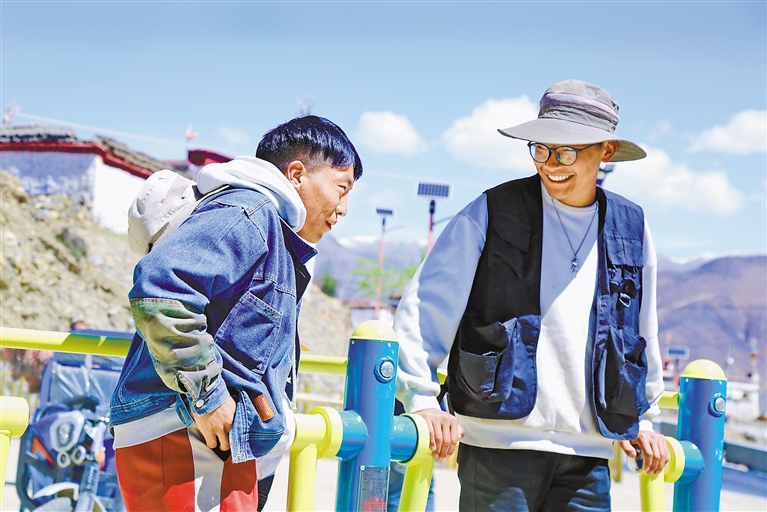 塔巴村村民在家门口的健身器材上锻炼。通讯员 果珍 记者 裴聪 摄