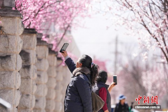 3月18日,随着雪域高原天气回暖,西藏拉萨市区道路旁春花绽放。拉萨城关区军民路两侧,花朵盛开,吸引不少市民和游客前来拍照留念。一时间,军民路成了拉萨今春热门打卡地,人们穿梭其中,感受春日的美好。图为市民在春花绽放的道路旁赏花。贡确 摄