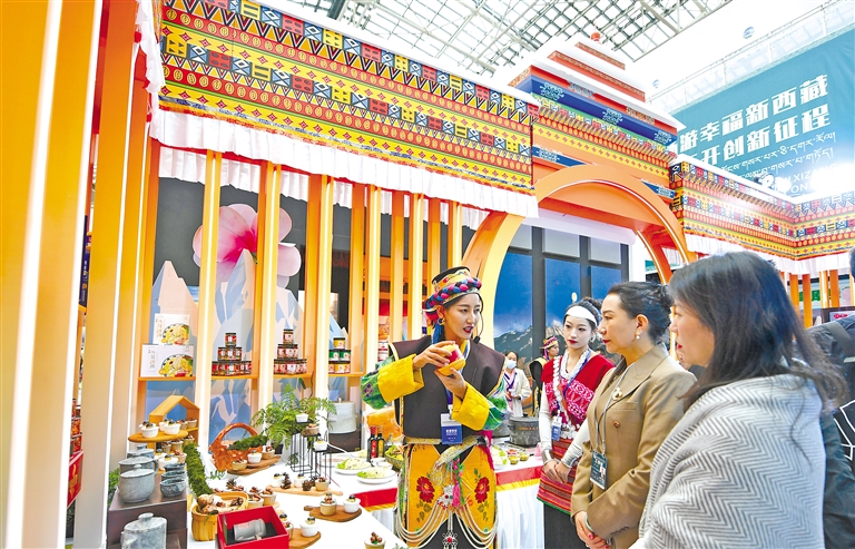 游客在第五届藏博会林芝馆内了解林芝特产。近年来,林芝市积极推动企业开拓市场,拓展经贸交流渠道。 经济日报记者 高兴贵 摄