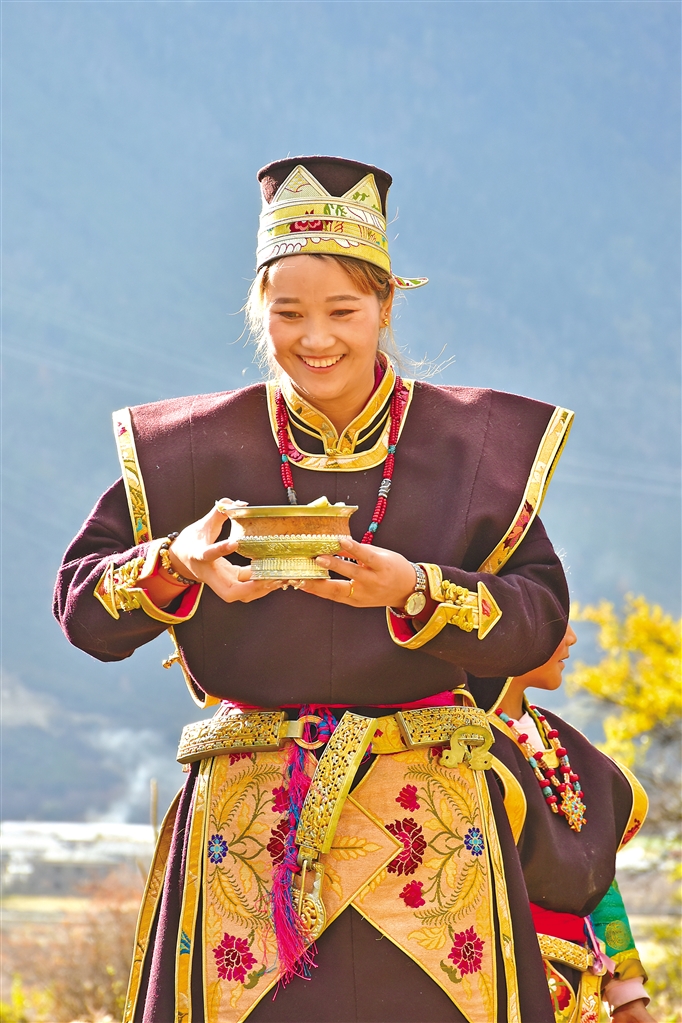 林芝市巴宜区布久乡朵当村,村民嘎珍身着节日盛装,向客人敬上美酒。当地广开致富门路,千方百计帮助群众增加收入,让老百姓的日子越过越甜。本报记者 王珊 摄