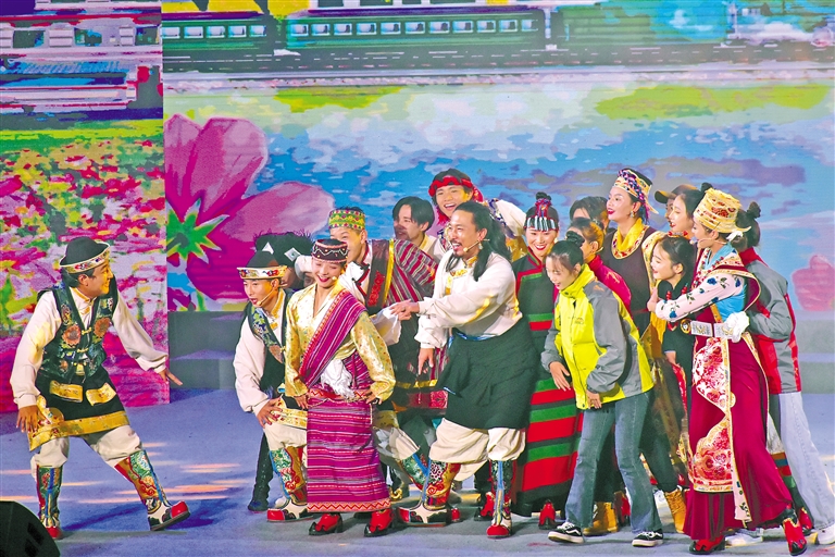 在林芝市主办的主题文艺晚会上,歌舞节目《沐浴幸福》展现了林芝各族群众获得感、幸福感、安全感显著提升的美好生活。 本报记者 谢筱纯 摄