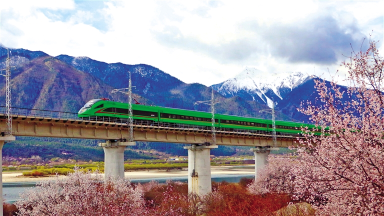 高原复兴号动车组列车行驶在拉林铁路米林至林芝区间。拉林铁路建成通车后,结束了藏东南不通铁路的历史,进一步完善了区域综合交通运输体系。 祁国庆 摄