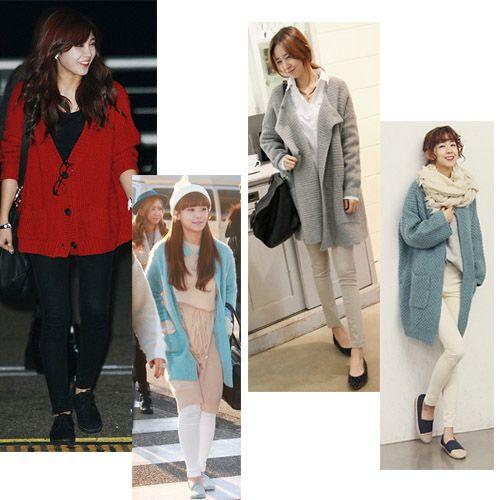 休闲味十足的针织开衫,无论是什么季节,都能巧妙美搭。本季最流行超大款系列的针织开衫,loose fit针织开衫和女性气息十足的图纹连衣裙作为最佳搭配的组合,能轻松穿出自然休闲的街头范儿。除此之外,厚厚的针织开衫最能穿出暖暖的冬季魅力。女子偶像组合A Pink成员郑恩地一身纯黑色装扮,以红色针织开衫作为外搭单品,打造了整身造型的亮点。