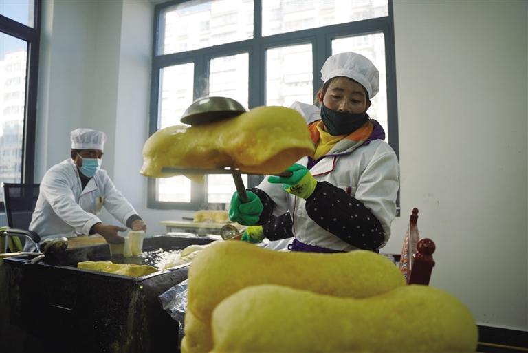 走进拉萨市城关区蔡公堂街道恩惠苑社区,“卡赛”香味扑鼻而来。揉面、切割、染色,恩惠苑社区搬迁群众巧手将面团捏成条形、圆形、蝴蝶形等不同样式,最后放到锅里炸至金黄;出锅时,再沥上油、撒上白糖,香甜可口、样式精美的“卡赛”就制作完成了,晾干后进行包装,然后出售。