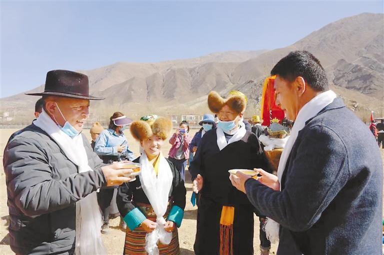 图为堆龙德庆区春耕春播仪式上,村民为犁手献上哈达,敬上一碗青稞酒,预祝新的一年风调雨顺、五谷丰登。 记者 拉巴桑姆 摄