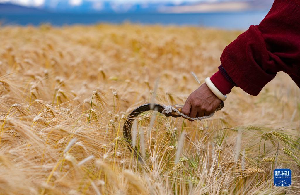 当日,西藏那曲市尼玛县文部乡文部南村村民开镰收割农田里的青稞。文部乡文部南村位于当惹雍措湖畔,海拔4645米,这里的村民以“萨马卓”(半农半牧之意)为主,在藏北高原独具特色。