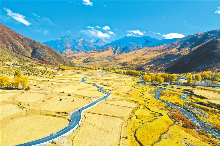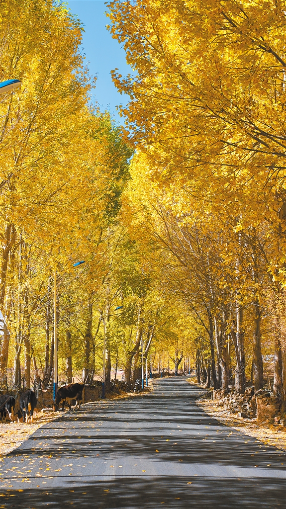 不仅如此,不管是往北通向唐嘎乡的路,还是往南通向章多乡的路,或是通往各个村庄的路,都在争先恐后地诉说着金秋的美丽。道路两旁耸立着金黄色的杨树,阳光透过树叶,散落在道路上,一种静谧而淡然的美,划过车窗。
