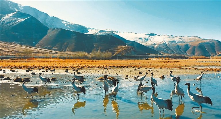 图为黑颈鹤在巴嘎雪湿地栖息。