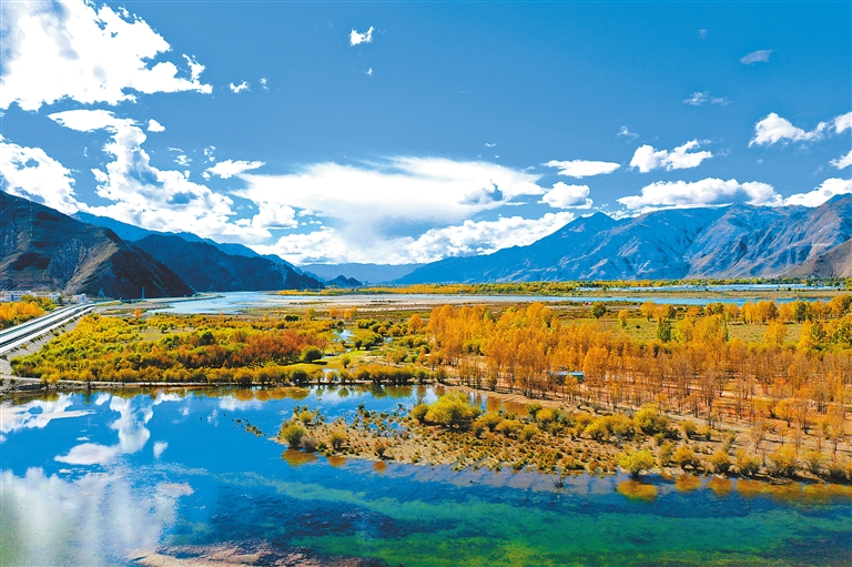 达孜区的秋色不仅仅局限于农田,其秋日的河流也别具一番风味。金黄的树叶飘落在河面上,被河水轻轻托起,河边的树木也在清澈的河水中映出倒影,随着水波荡漾,一幅流动画卷舒展开来。