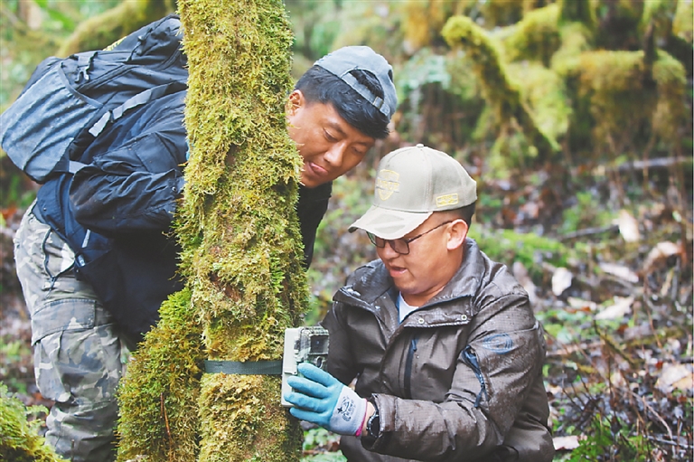 林芝市墨脱县格当乡巡林员和蚂蚁森林专家在安装红外相机。通讯员 郎玲 记者 王敏 摄