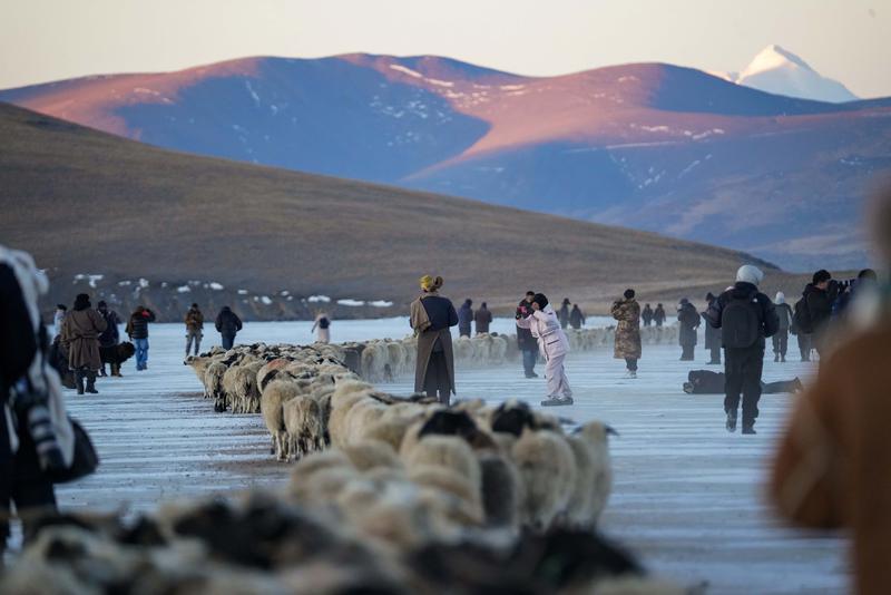 年复一年,惊艳又震撼的“冰上赶羊”盛宴,在普莫雍措已上演了千年。这一独特的自然人文景观构成了冬日里绝美的风景,也吸引着众多游客前来打卡。
